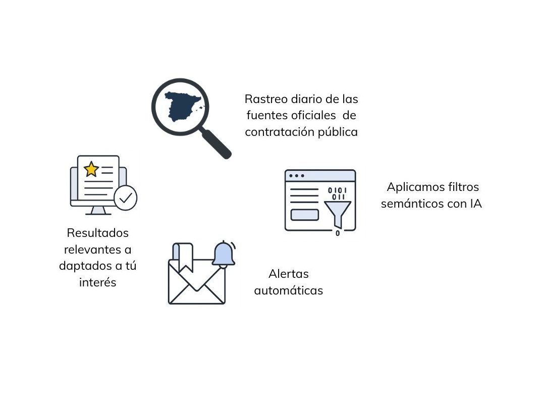 Rastreando diariamente fuentes oficiales, nuestra herramienta clasifica y prioriza licitaciones mediante modelos de IA entrenados por expertos. Solo te muestra lo que realmente encaja contigo, en el momento justo.